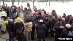 Дар пойтахти Украина ҳарорати ҳаво ба сифр наздик шудааст. Даҳҳо нафар ва асосан пиронсолон барои гирифтани палав, ки асосан аз биринҷу гӯшт омода мешавад, саф кашидаанд.